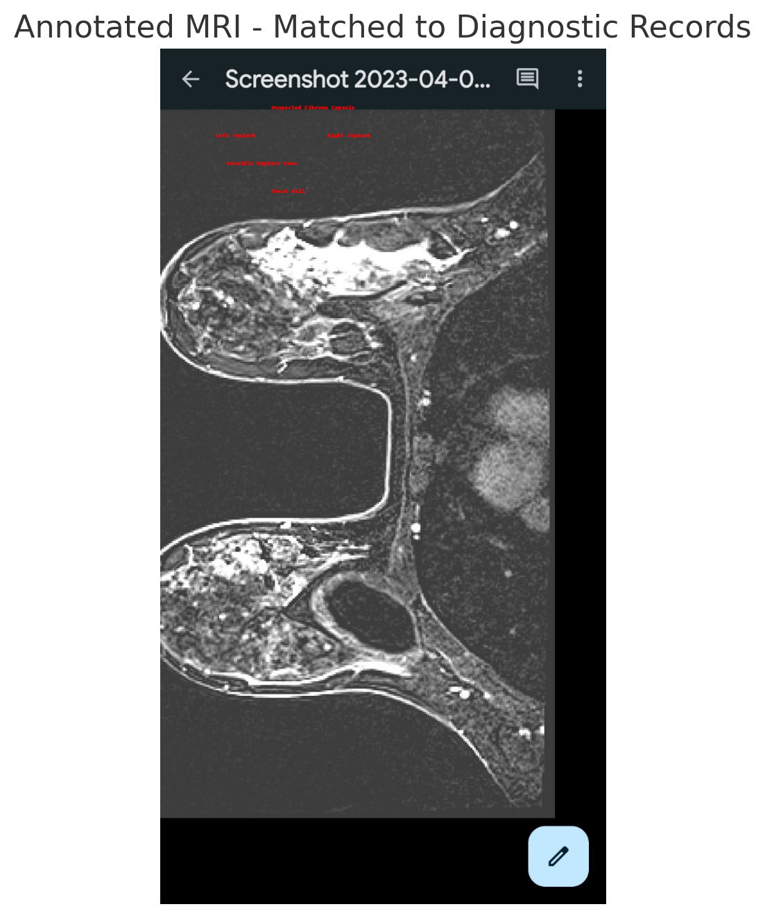 - Implant Rupture/Silicone Leakage: Breach in implant shell integrity with silicone material outside the implant